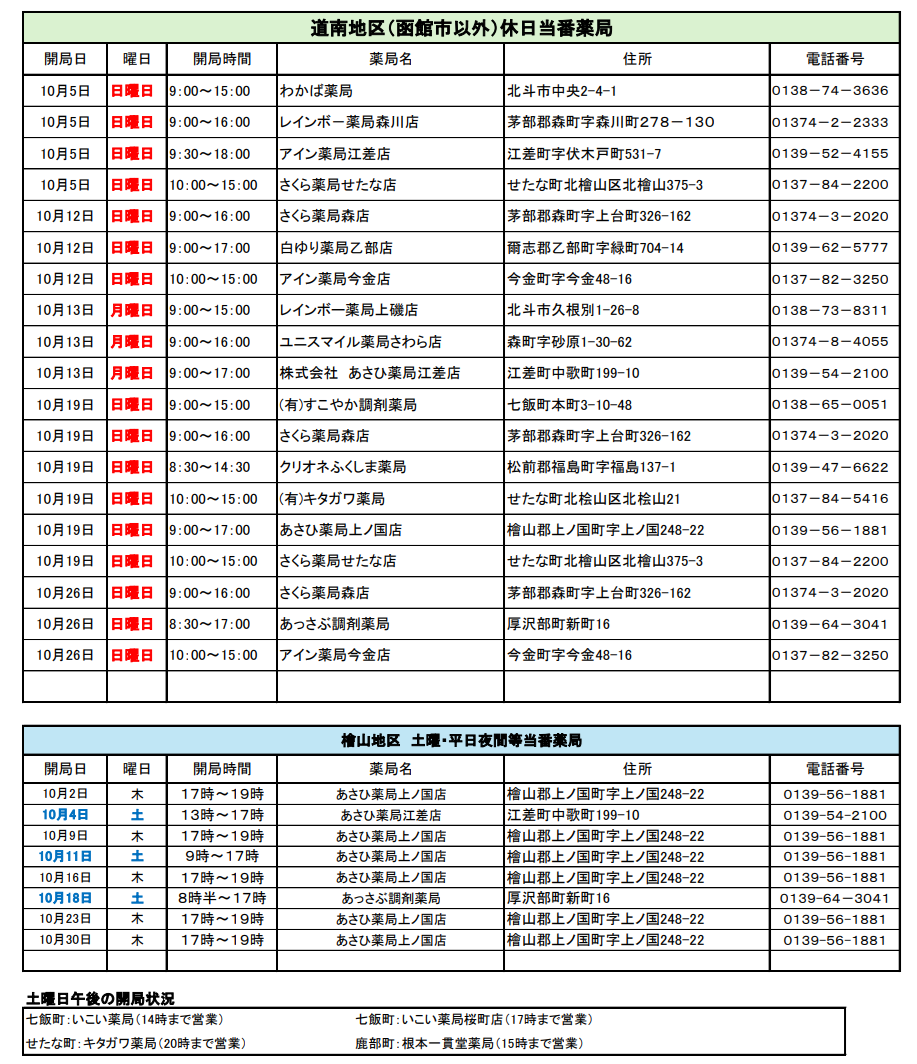 道南地区 10月分休日当番薬局(PDFファイル)※9/29掲載