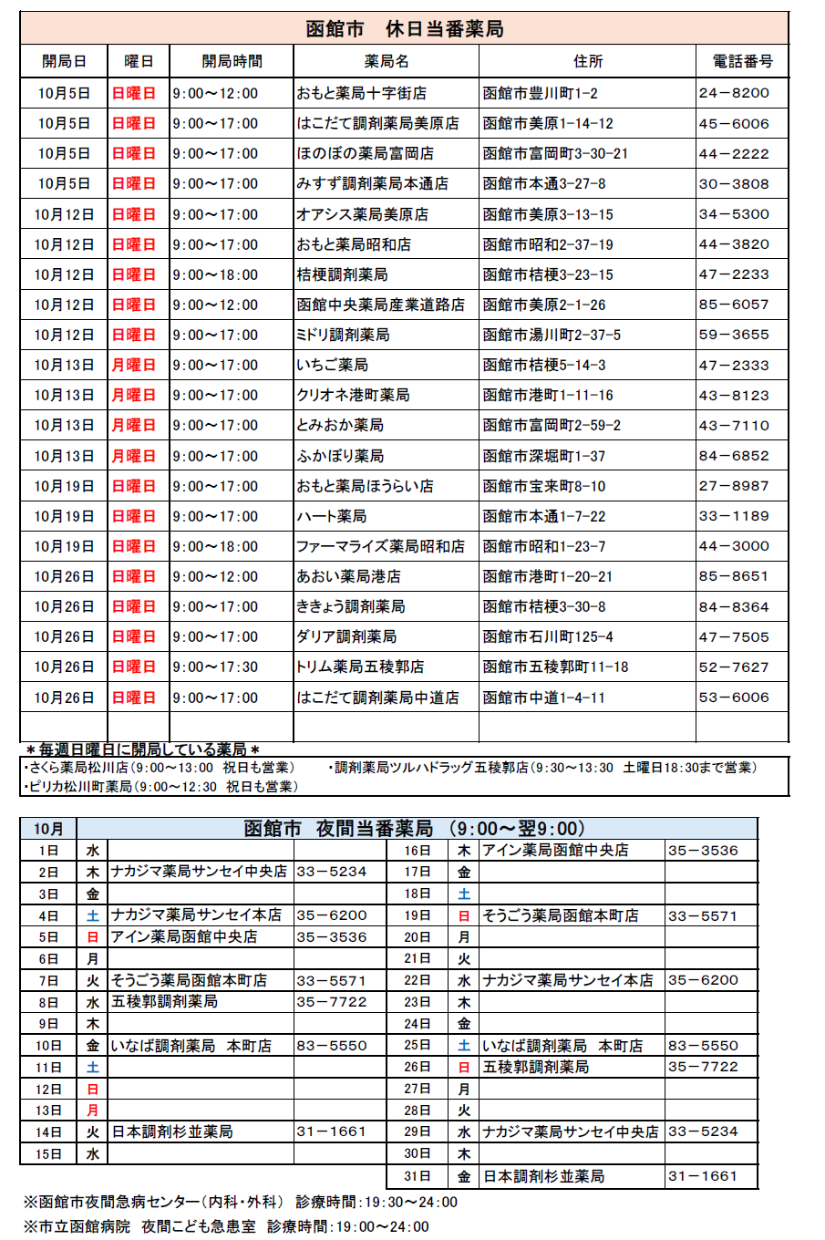 函館市 10月分休日当番(PDFファイル)※9/29掲載